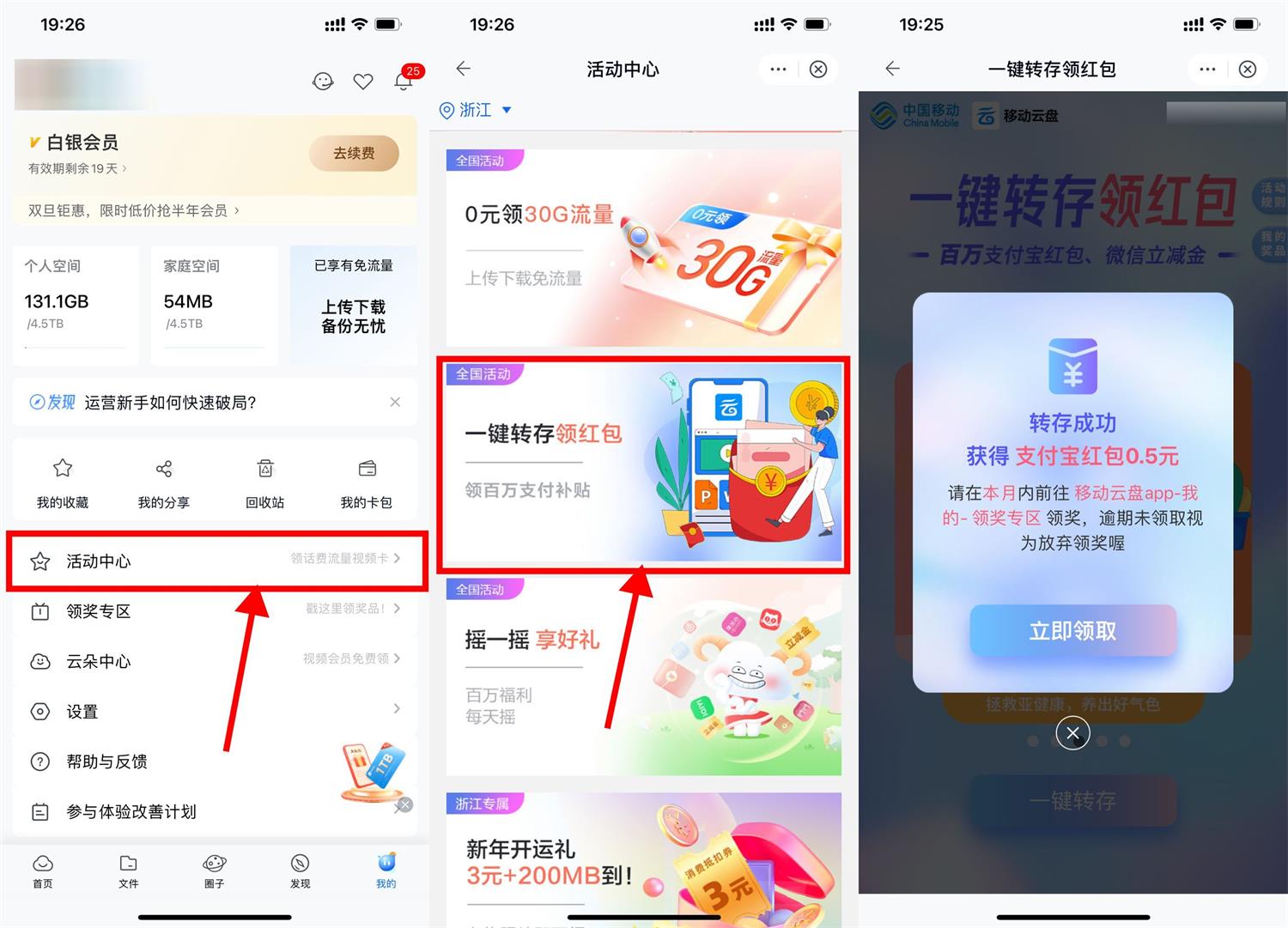 移动云盘APP->我的->活动中心->一键转存抽0.5元支付宝红包/1~2元微信立减金