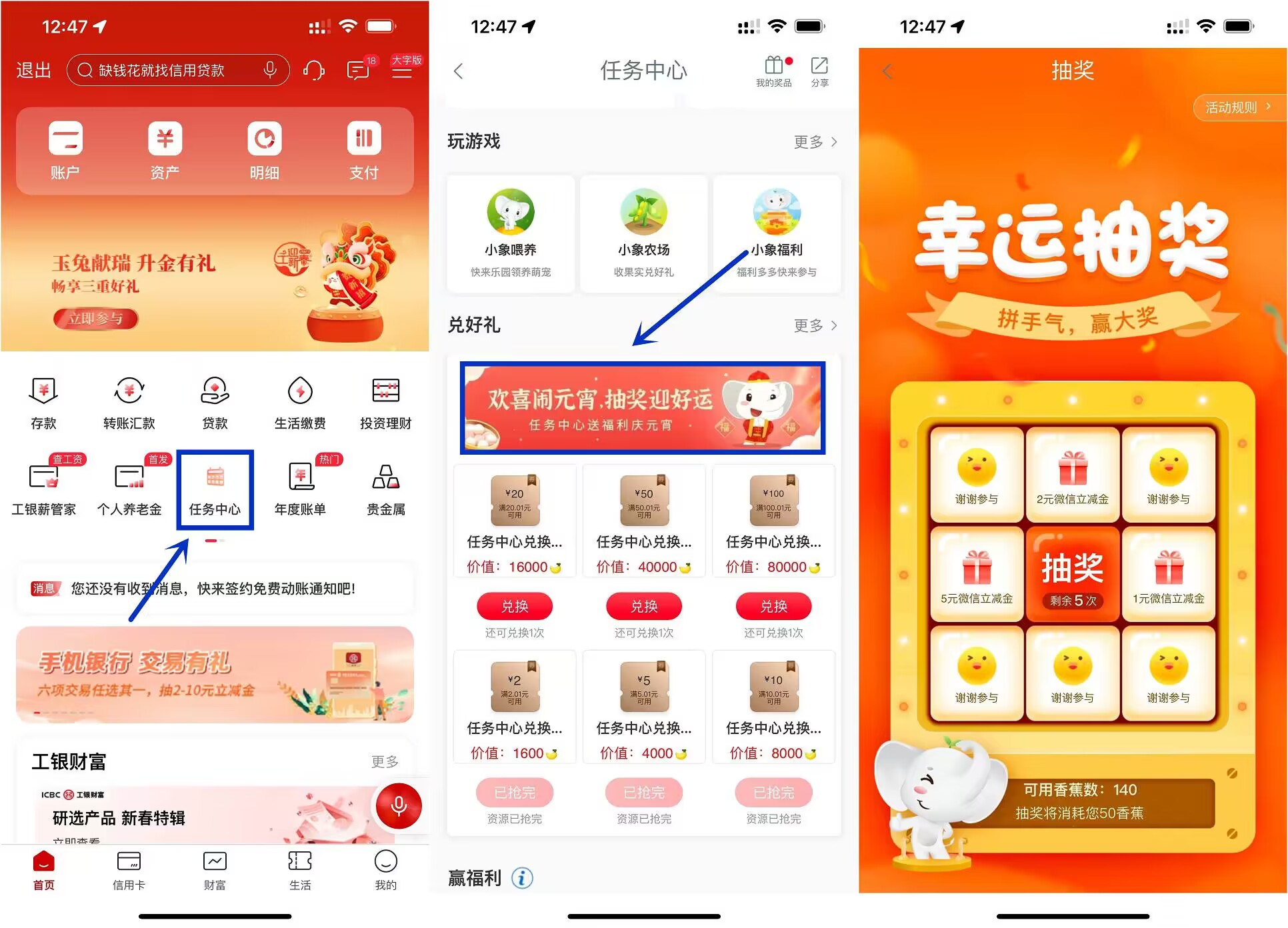 工行APP搜索“任务中心”->下拉点击横幅进入->每天签到可得随机香蕉,每50香蕉抽1次微信立减金