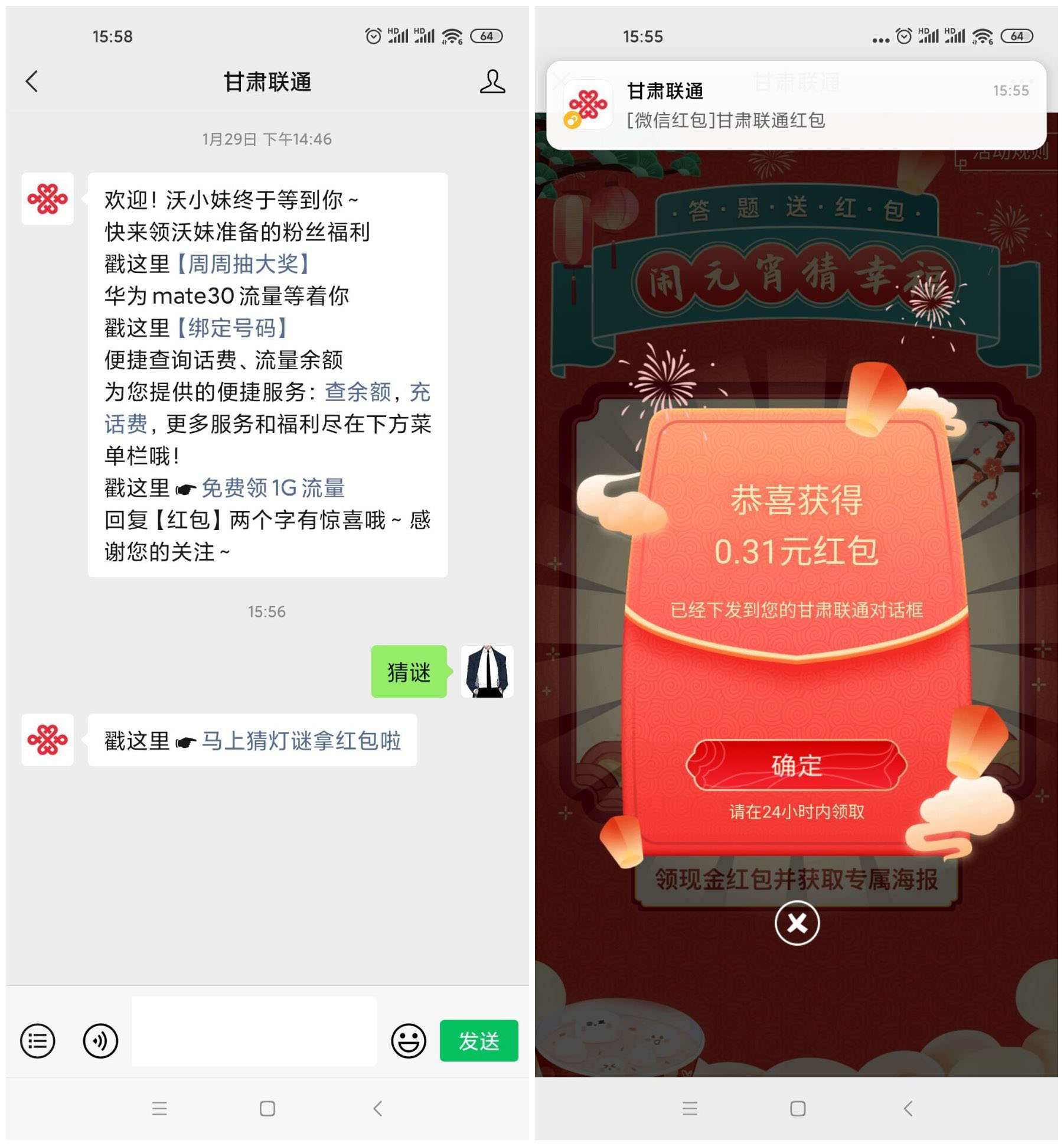 微信关注公众号“甘肃联通”->发送->猜谜->点推文进去活动->答题抽随机红包