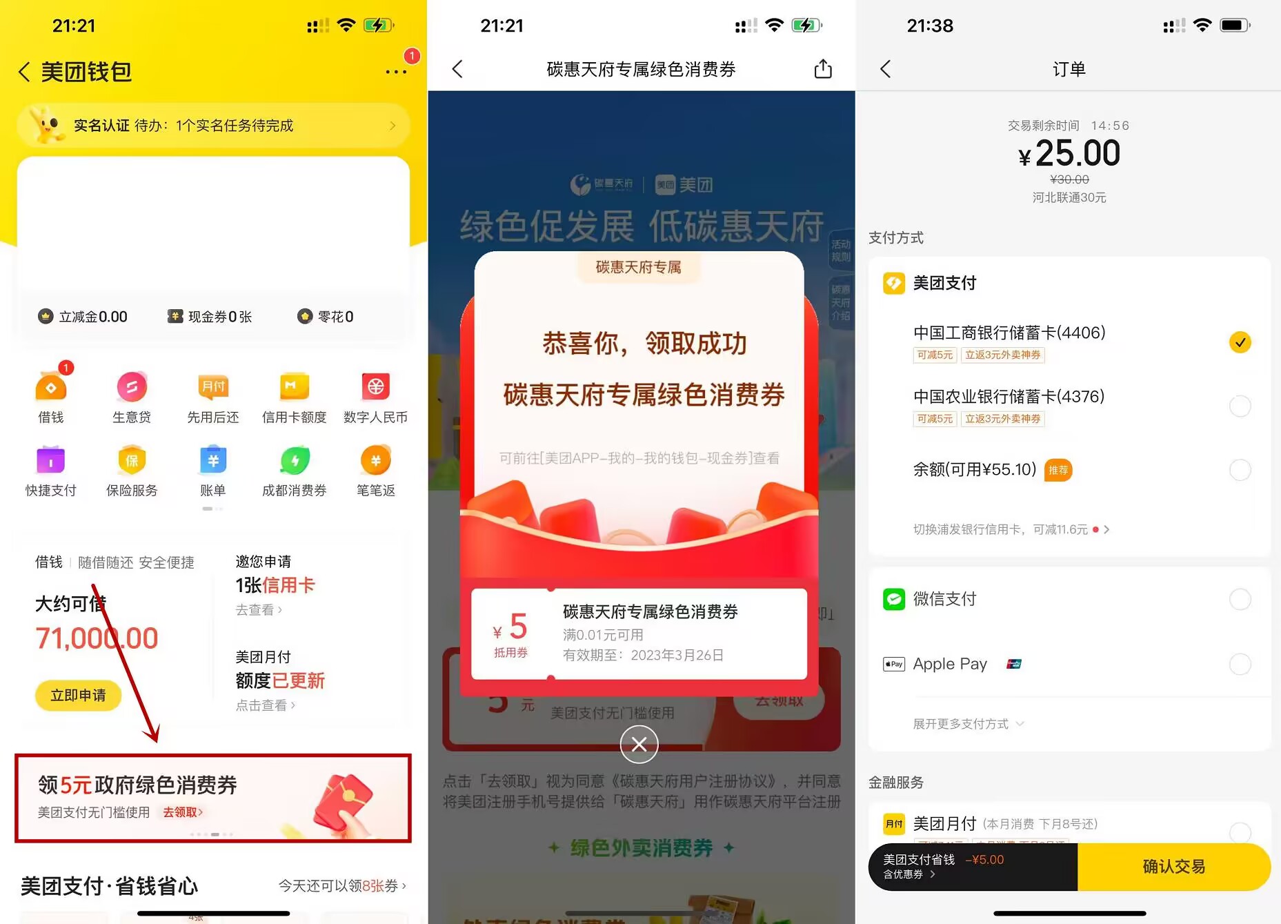 虚拟定位“成都”->美团APP我的钱包->点击领取5元绿色消费券->返回首页“手机充值-Q币充值”充5Q币抵扣券后0.01元