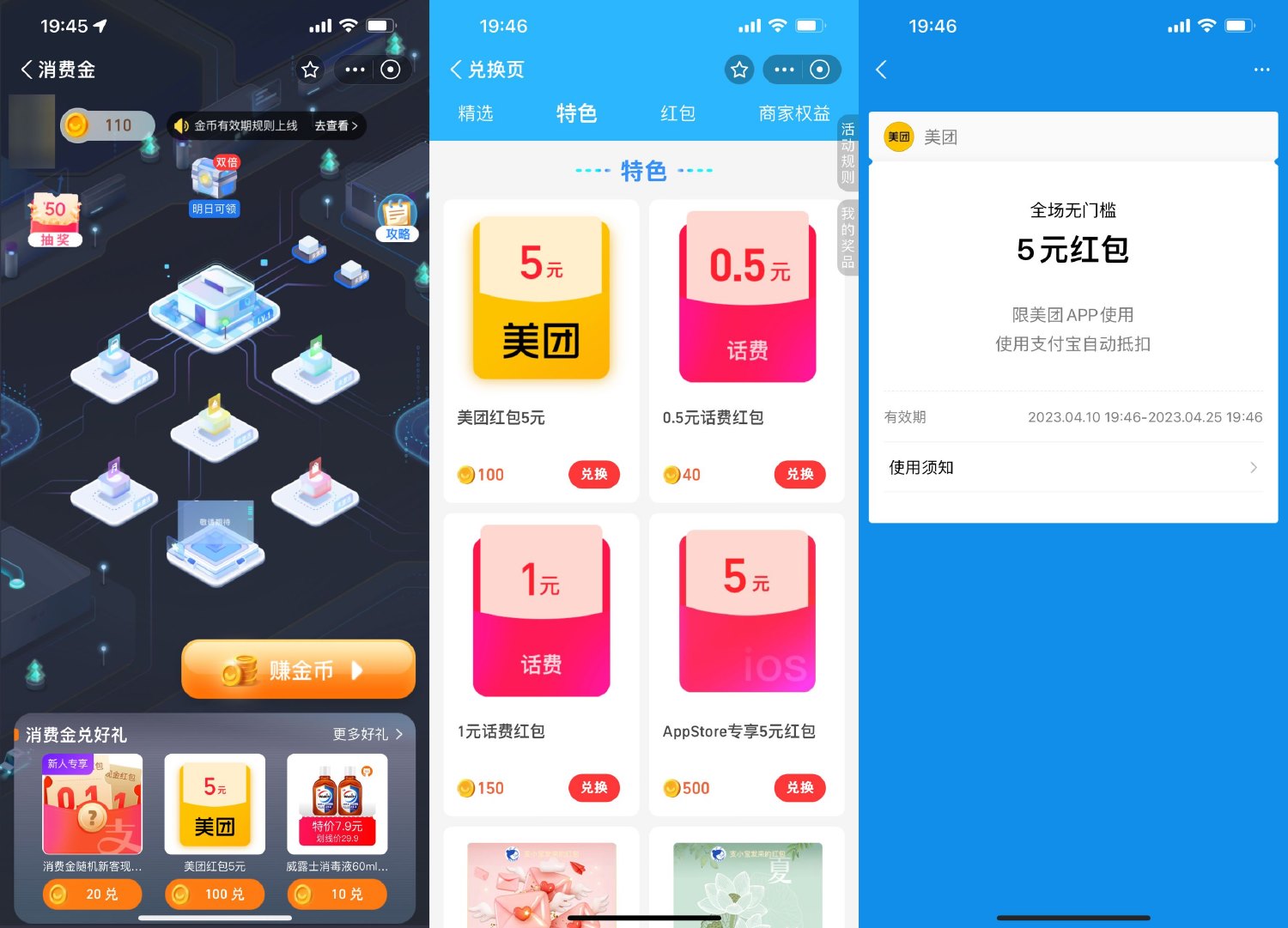 1、支付宝搜索“消费金”->简单浏览得消费金,100消费金兑换5元美团无门槛(部分人只有40消费金兑换2元无门槛)