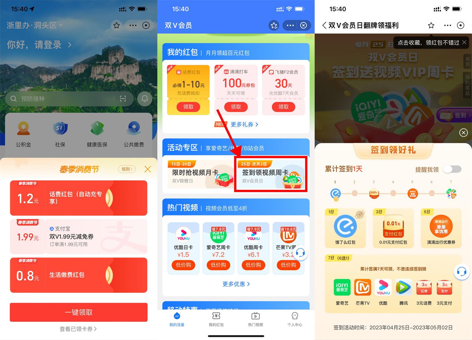 支付宝搜索“双V会员”->活动专区“签到领视频周卡”->连续签到7天领取视频会员周卡
