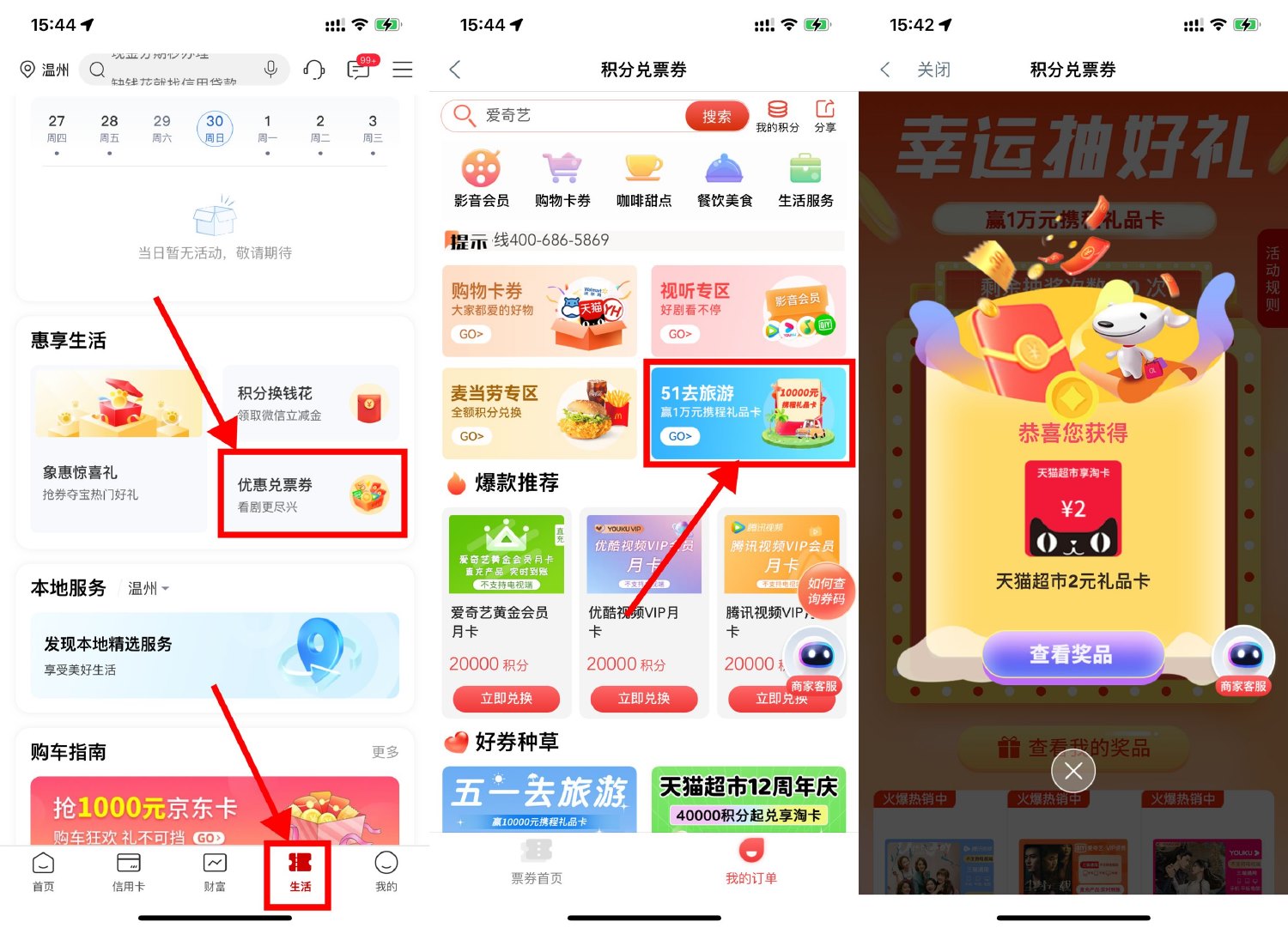 1、工行APP底部“生活”->下拉找到“优惠兑票券”->51去旅游