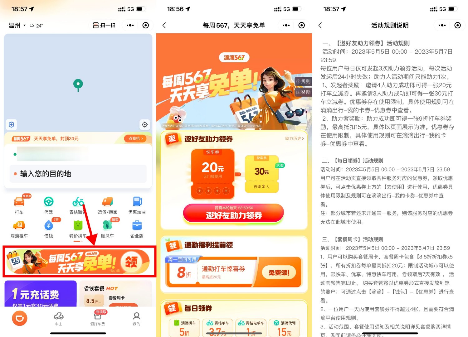 微信进入小程序“滴滴出行”->每周567天天享免单->邀请4/7人助力得20/30元无门槛打车券,活动截止到5月7日
