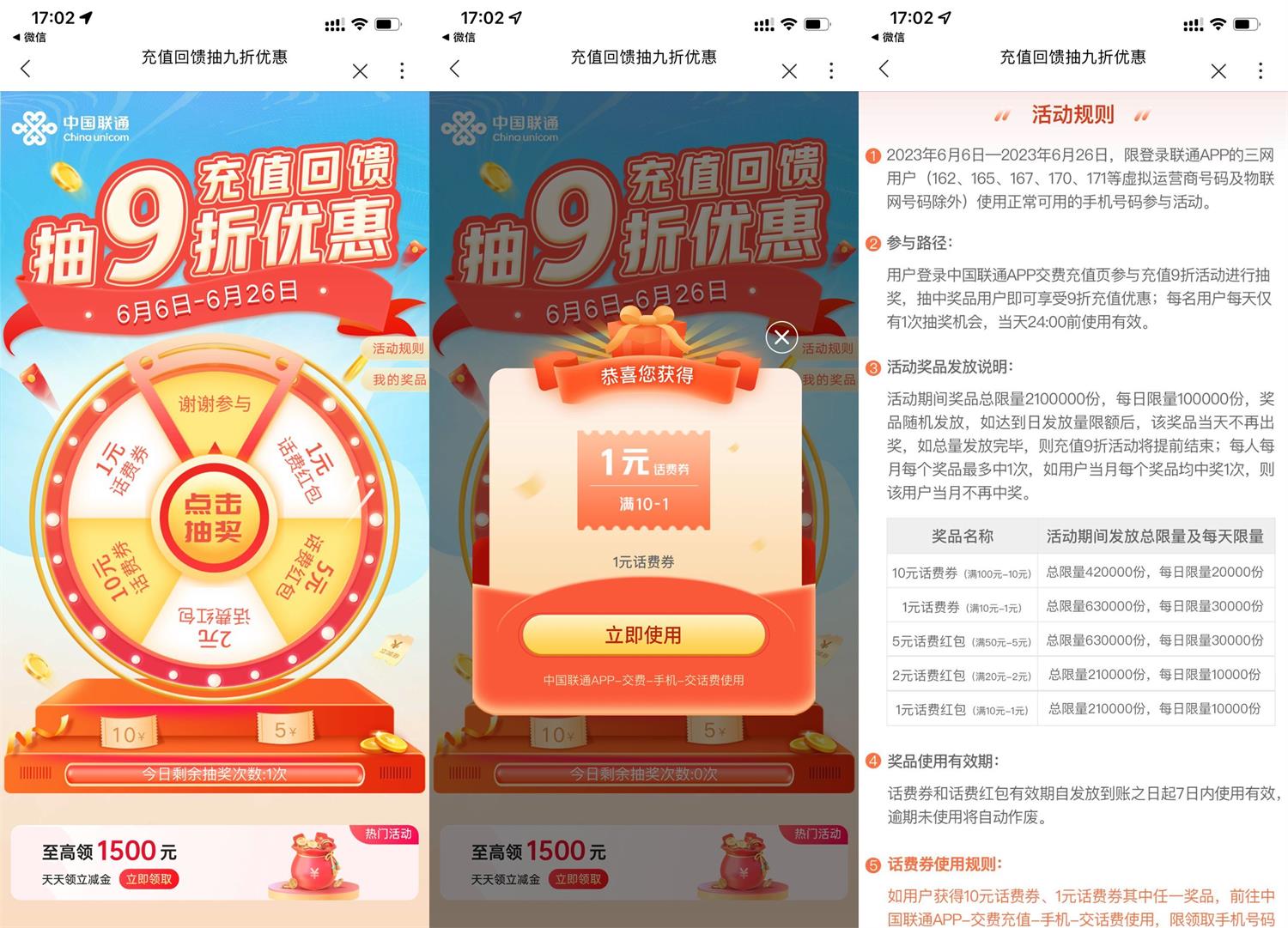 打开地址->跳转到联通APP->直接抽话费满减券,充话费时即可抵扣(相当于9折话费)