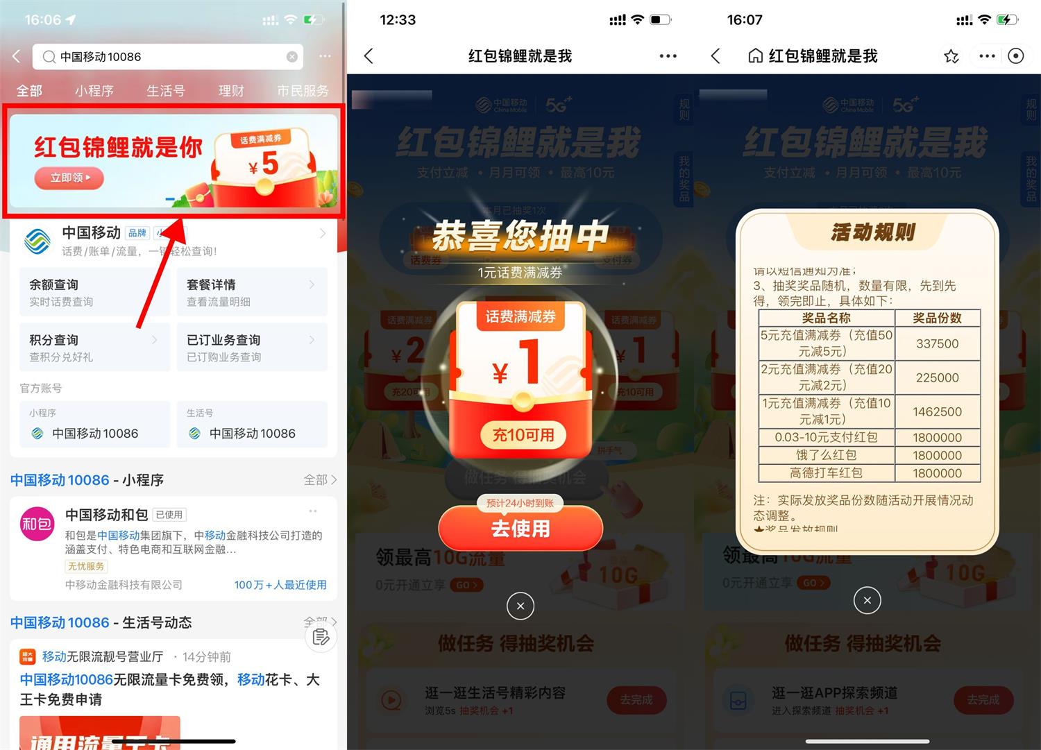 支付宝搜索“中国移动10086”->点击横幅进入->直接抽1~5元话费满减券,在中国移动APP充话费即可抵扣(相当于9折充话费)