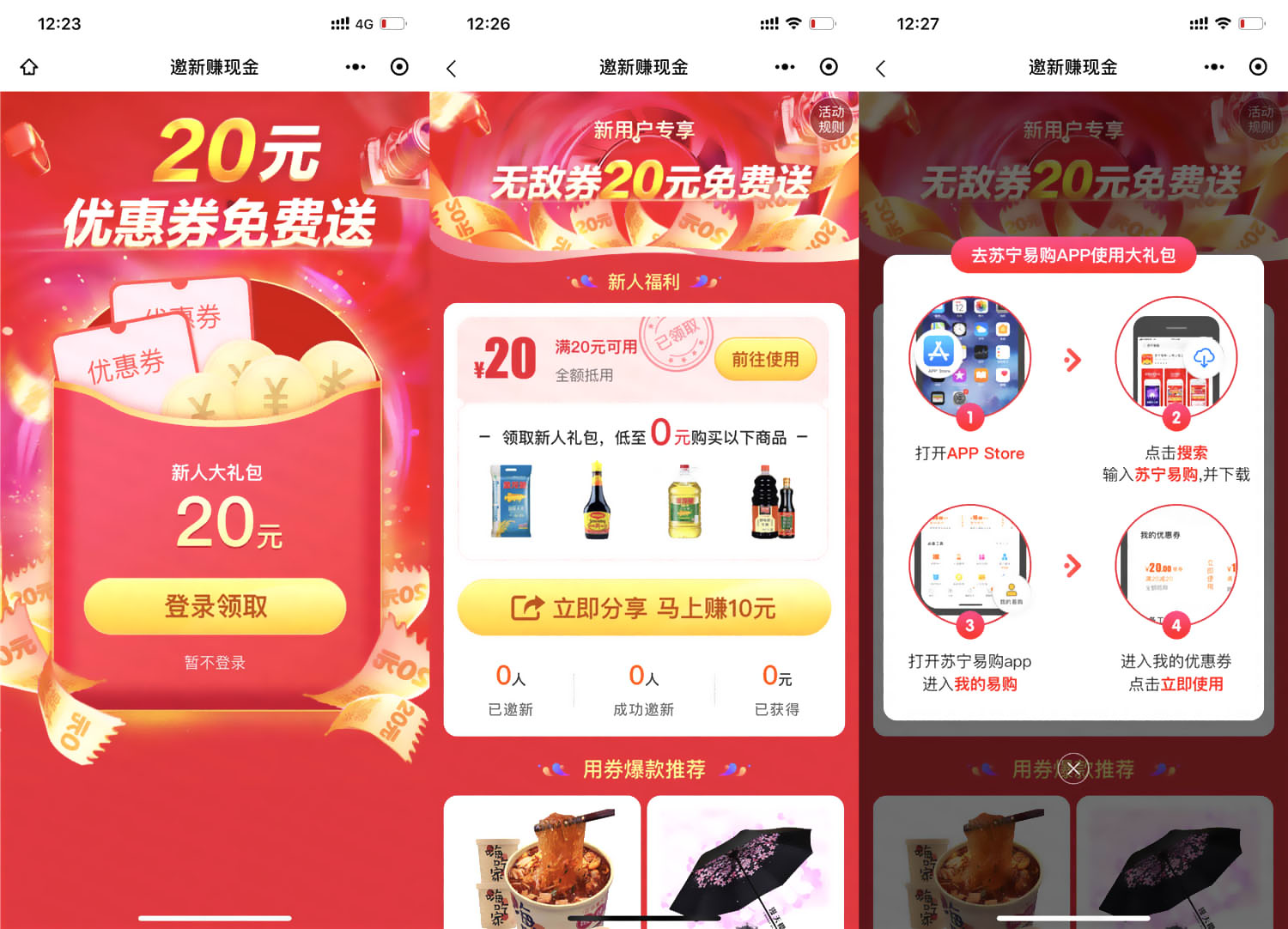 微信扫码领取->是新号就能领到20元->然后实名领取->下载苏宁易购app在我的易购->我的优惠券里