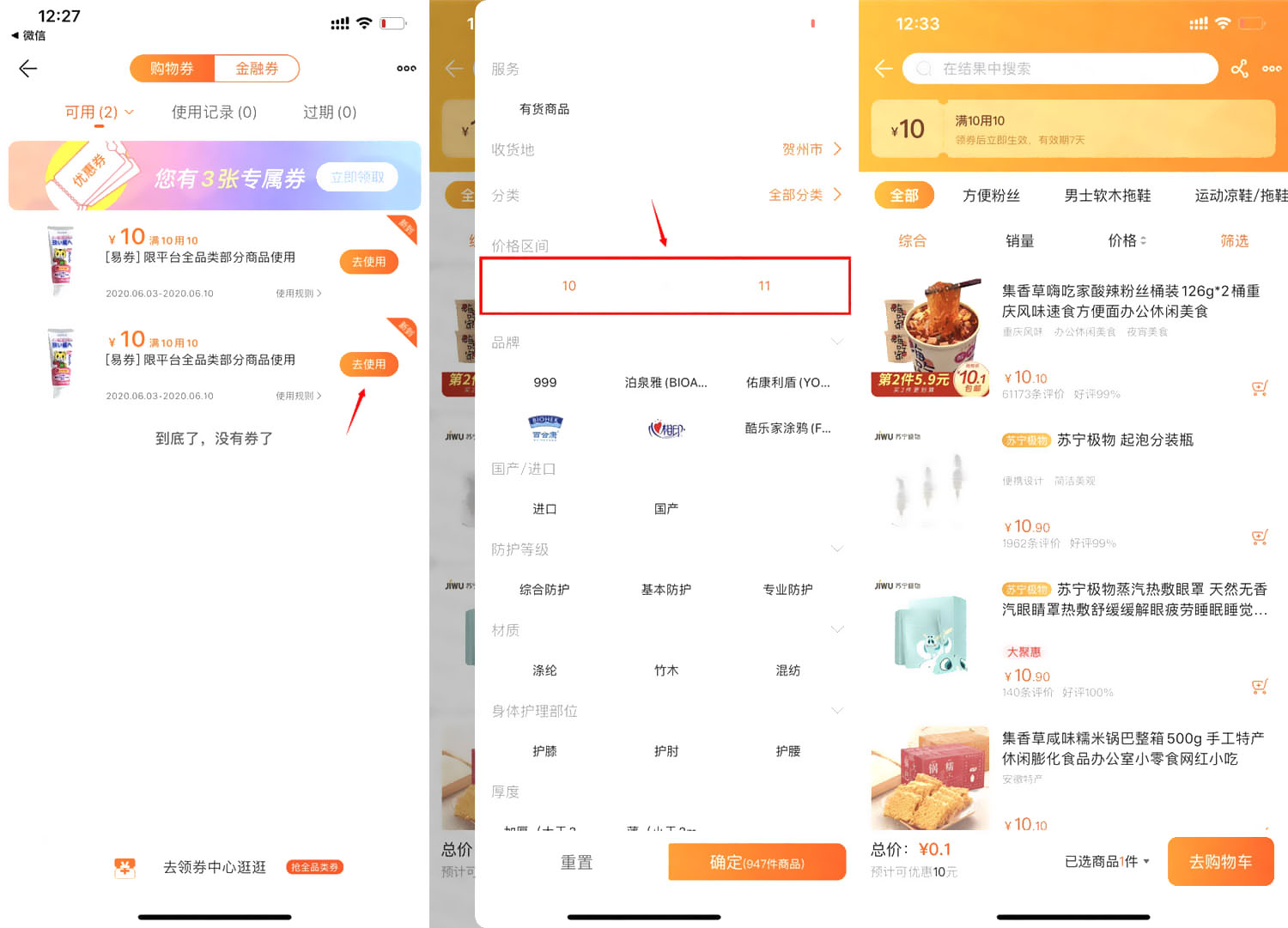 然后我们点击去使用->右上角筛选价格区间的->就出来一堆价格区间的商品可以0.01元拿下