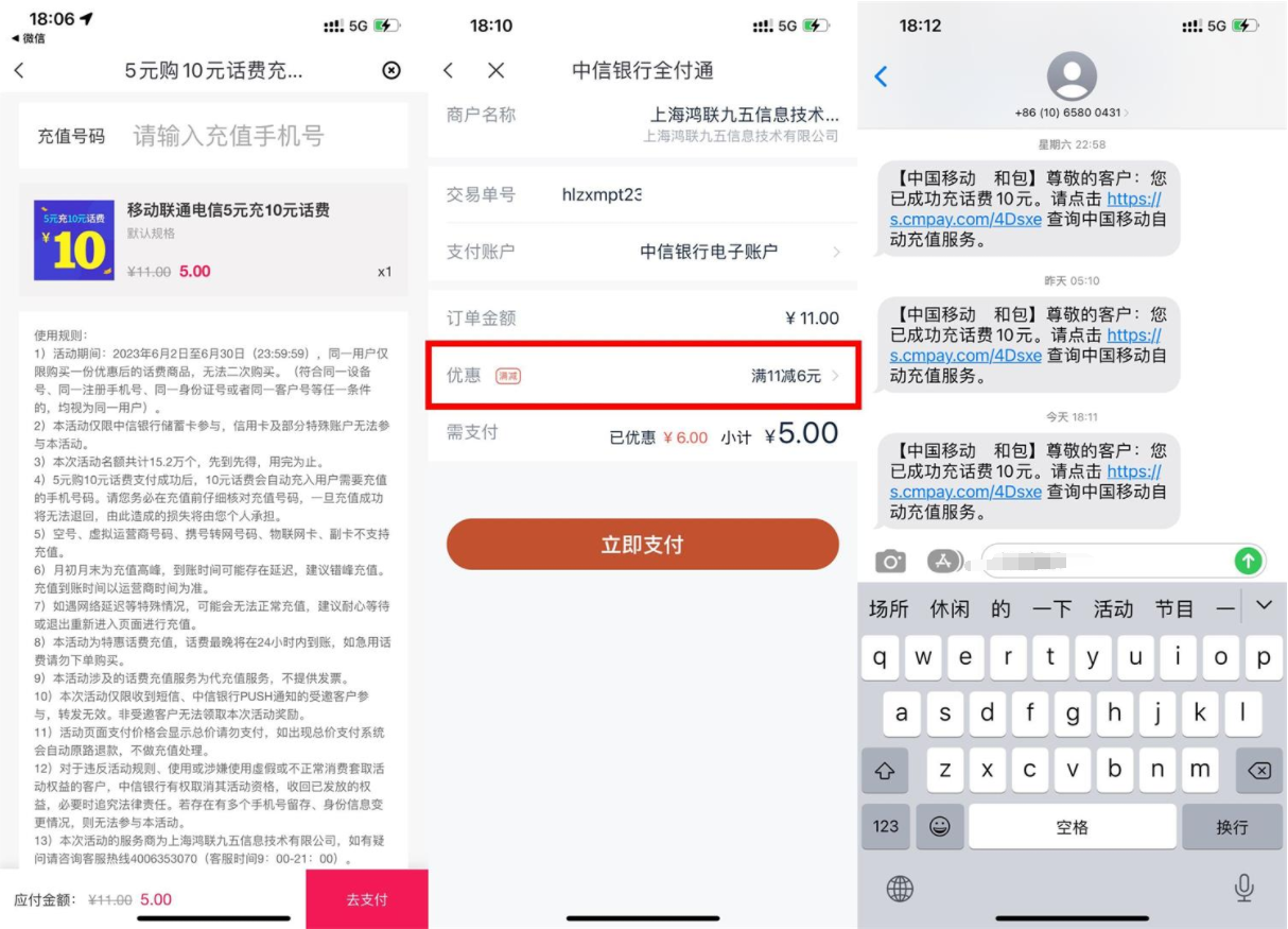 中信银行5元充10元话费秒到