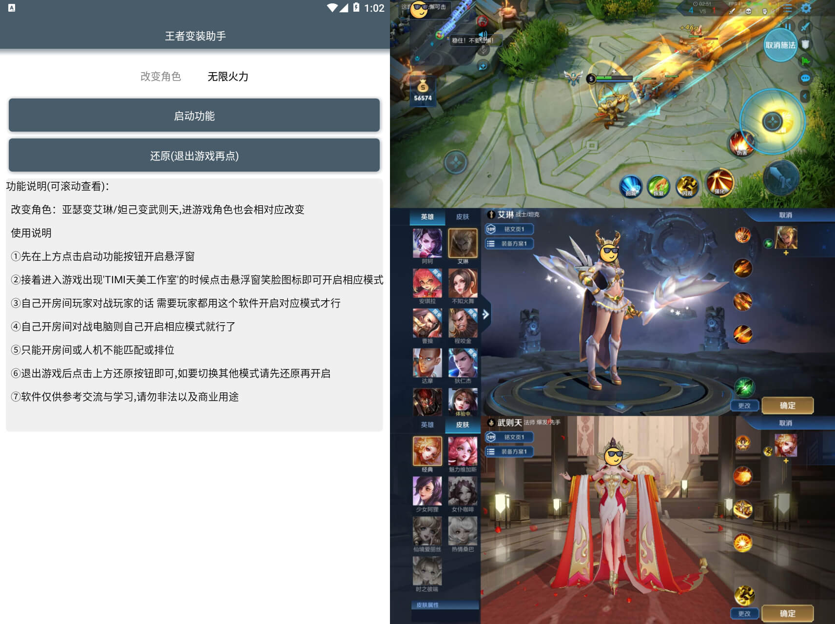 王者变身助手App支持一键英雄替换,让你在游戏中免费体验绝版英雄角色,亚瑟变艾琳妲己变武则天,并且还支持切换无限火力模式,无限金钱技能无冷却。可拉好友一起开黑,赶紧下载分享好友一起痛快体验!!