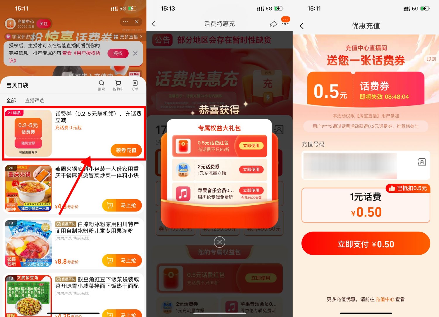 活动1点购物袋进入领0.5元话费券->活动2自动弹出0.5元话费券->两个活动都只能电信号码参与!