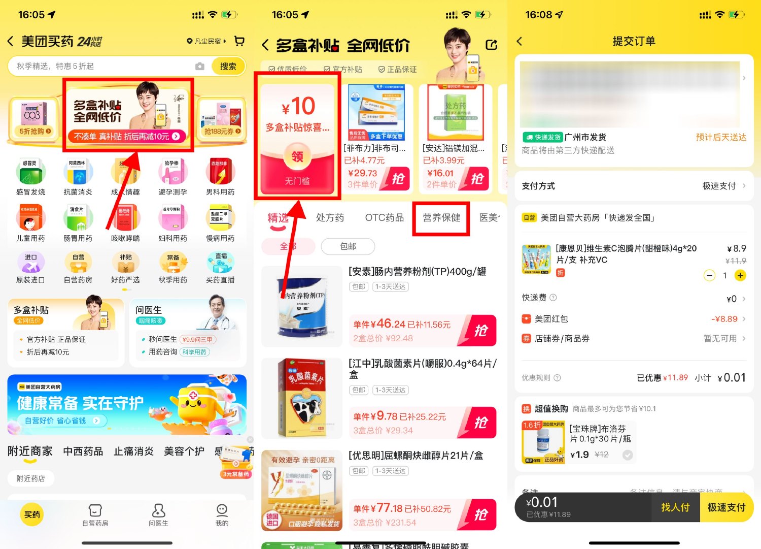 美团APP首页“买药”->多盒补贴->领10元无门槛券,可以0.01元买康恩贝VC泡腾