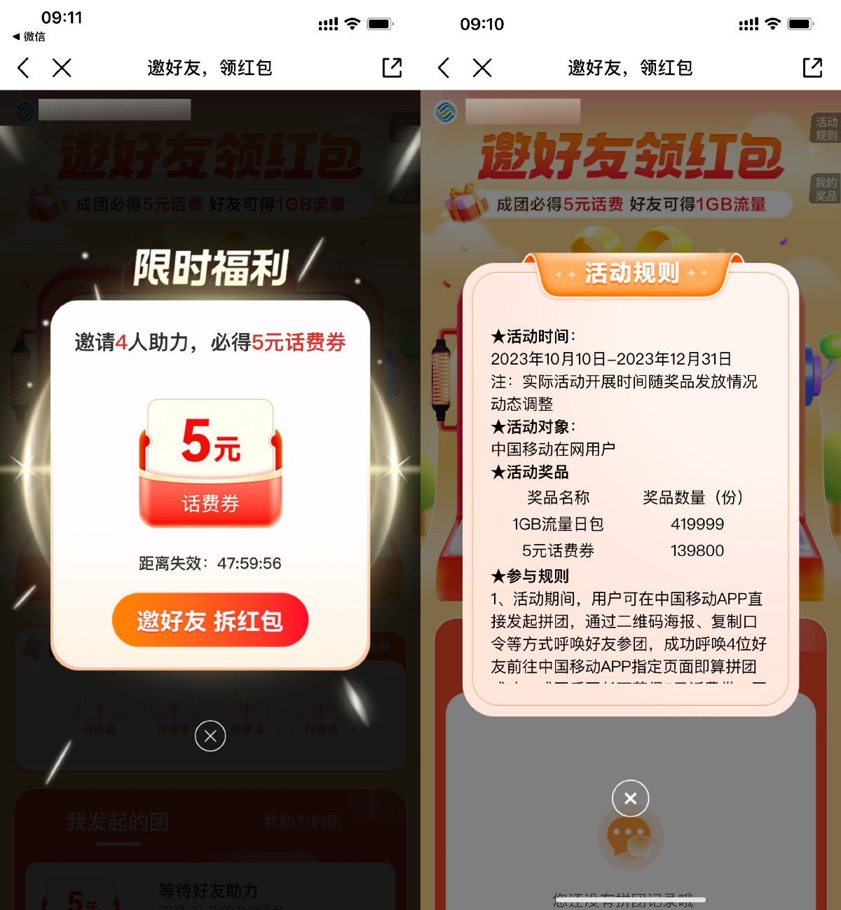 打开地址跳转到移动APP->开团邀请4个好友助力得5元话费券,最多可开团5次共25元话费(助力者必得1GB日包流量)