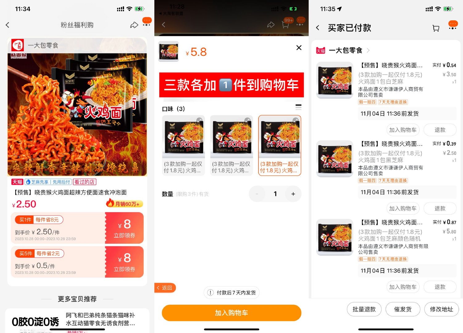 淘宝搜“拍照领红包”随便拍下领多个红包->在打开活动领8元券,把三款各加1件到购物车,勾选上一起付就行了