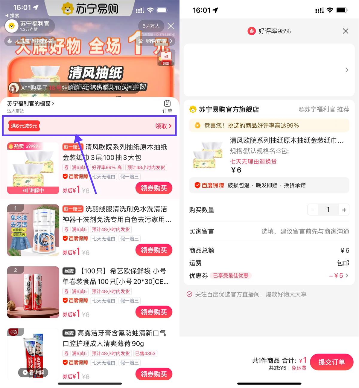 打开地址跳转到百度APP->关注领6减5元券->购物袋里有很多1亓包邮的实物